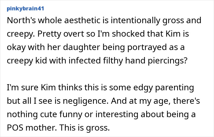 “This is all being flaunted as part of a sick, twisted branding experiment, with the brand pushing a troubled, unparented pre-teen North onto the public. I’m sure Kim thinks this is edgy parenting, but all I see is negligence.”