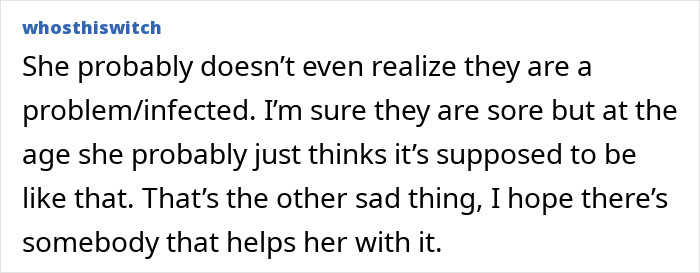 “She probably doesn’t even realize they’re a problem or infected. I’m sure they’re sore, but at her age she probably just thinks it’s supposed to feel like that,” a commenter wrote.