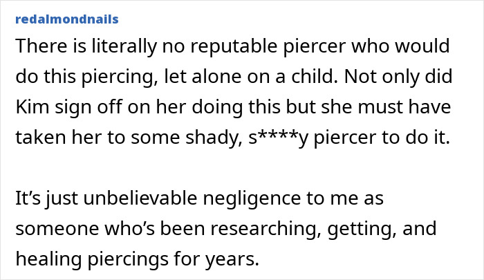“There is literally no reputable piercer who would do this piercing, let alone on a child,” another stated.