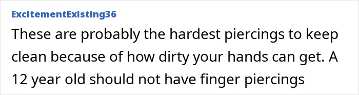 “These are probably the hardest piercings to keep clean because of how dirty your hands can get,” a viewer argued. “A 12 year old should not have finger piercings.”