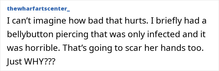 “A 12 year old with visibly infected hand piercings being shown off online is not self expression. That’s a kid in pain. Infections hurt. They need care. A parent is supposed to step in, not treat it like part of the aesthetic,” a user argued.