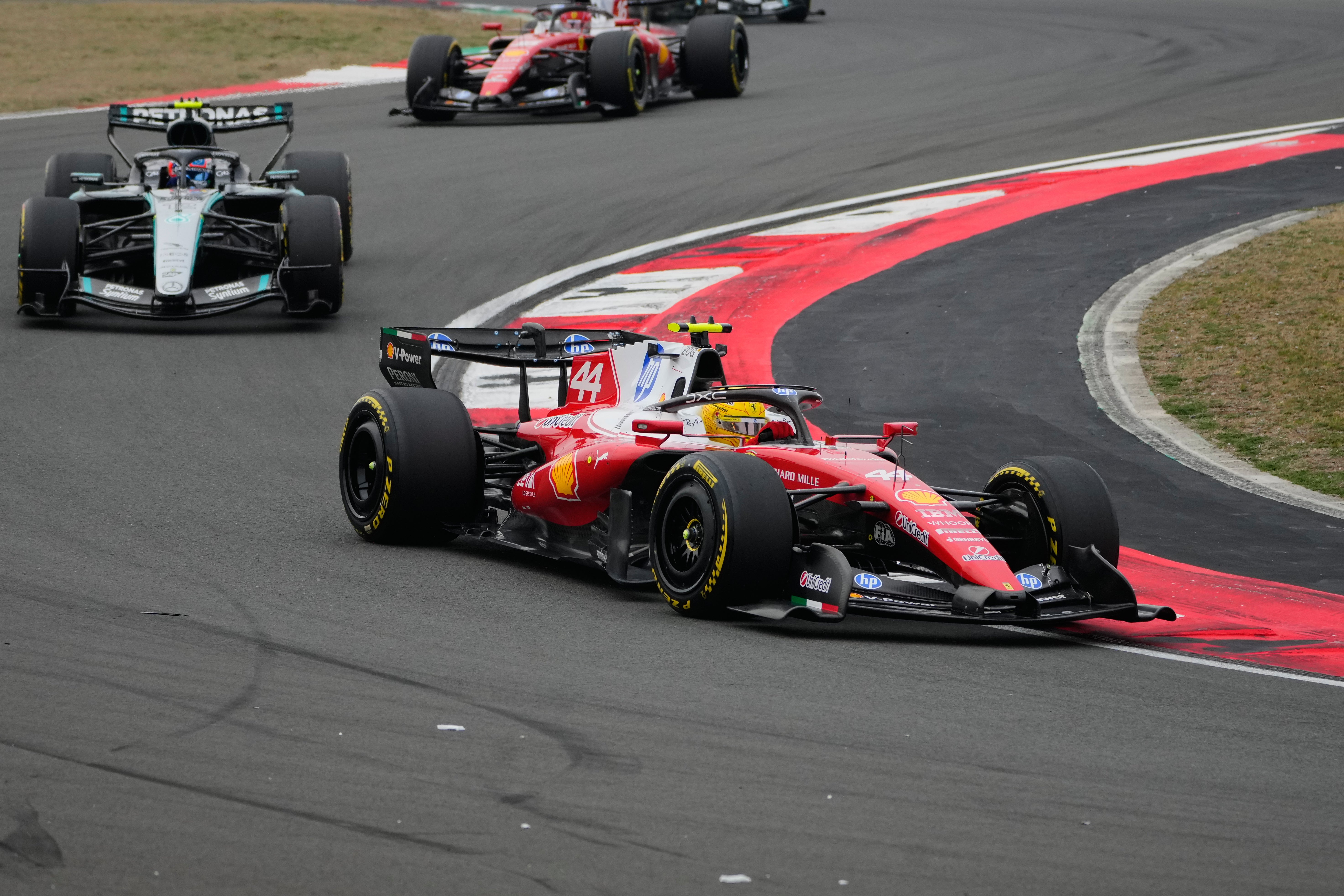 Hamilton started third, but he cleared both the Italian and Russell at the first corner in his fast-starting Ferrari.
