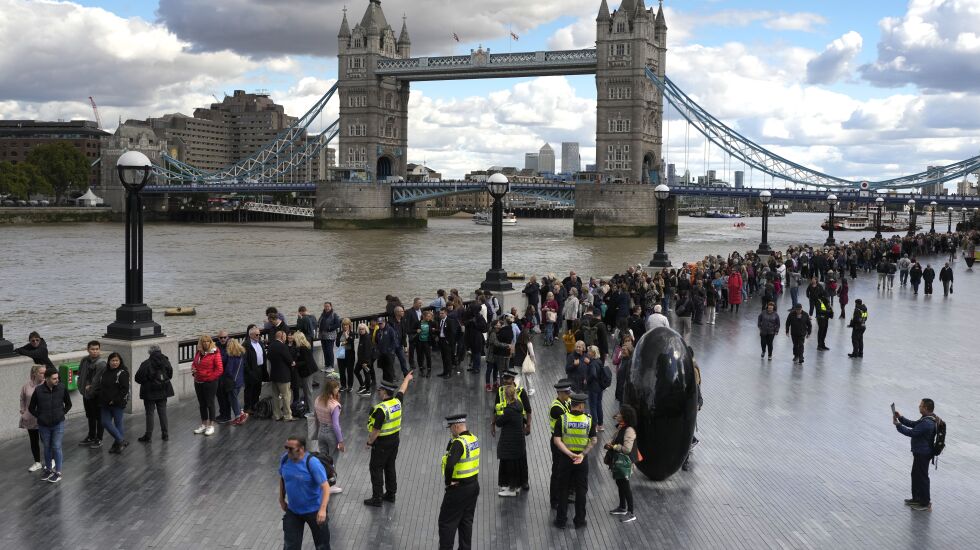 LONDON — A surging tide of people — ranging from London retirees to former England soccer captain David Beckham — have lined up to file past Queen Elizabeth II’s coffin as it lies in state at Parliament, so many that authorities had to call a temporary halt Friday to more people joining the miles-long queue.