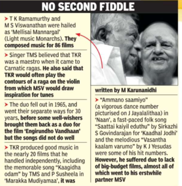 CHENNAI: One half of the ‘Mellisai Mannargal’(Light music Monarchs) — the Viswanathan-Ramamurthyduo — Tiruchirapalli Krishnaswamy Ramamurthy (TKR) was in a class of his own. Veteran singers recall that TKR was so proficient that he could make out which musician in the orchestra had struck a false note or went off key even if there were a hundred of them.