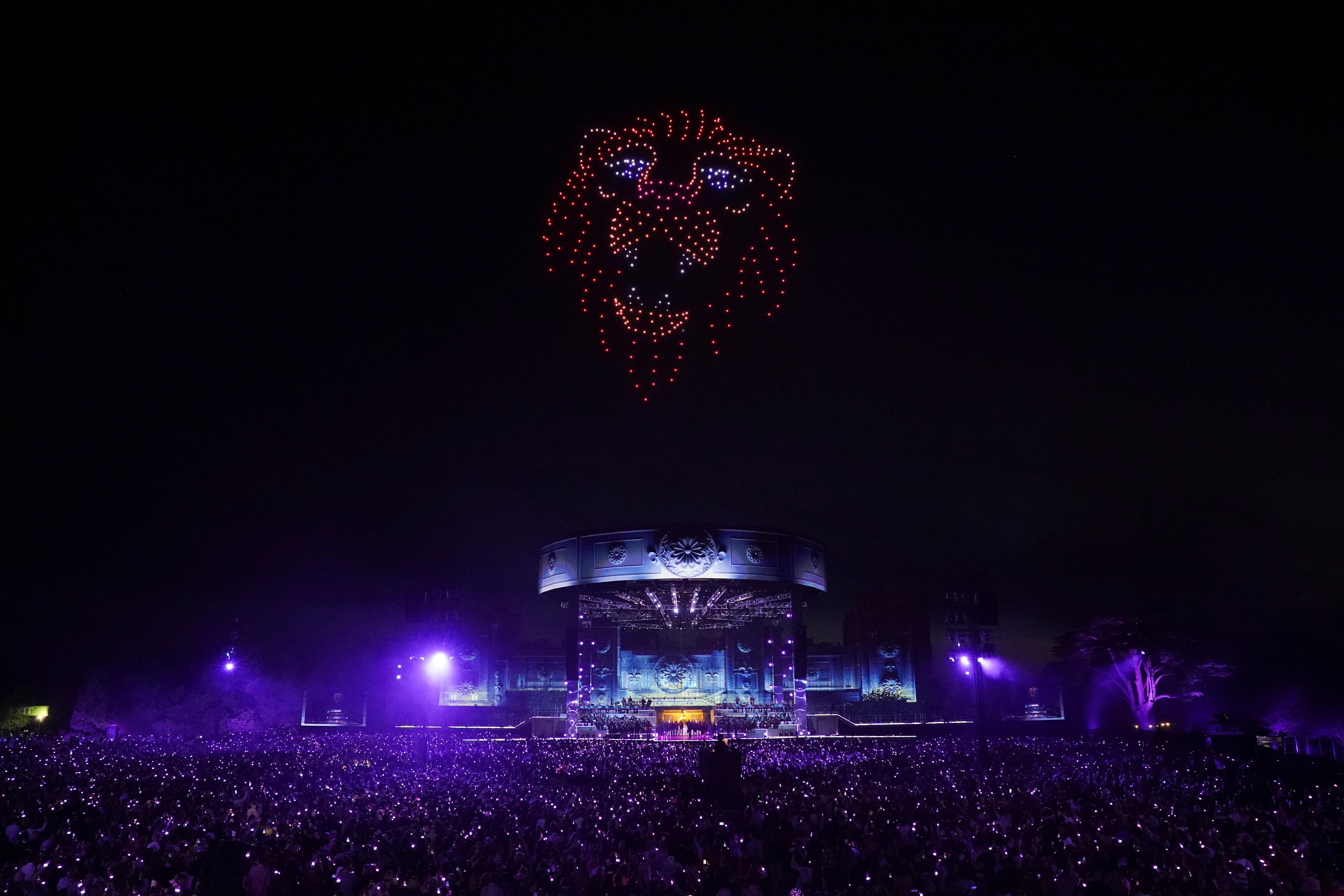 A lion appeared in the sky while Katy Perry sang Roar as a part of a drone light display during the concert.