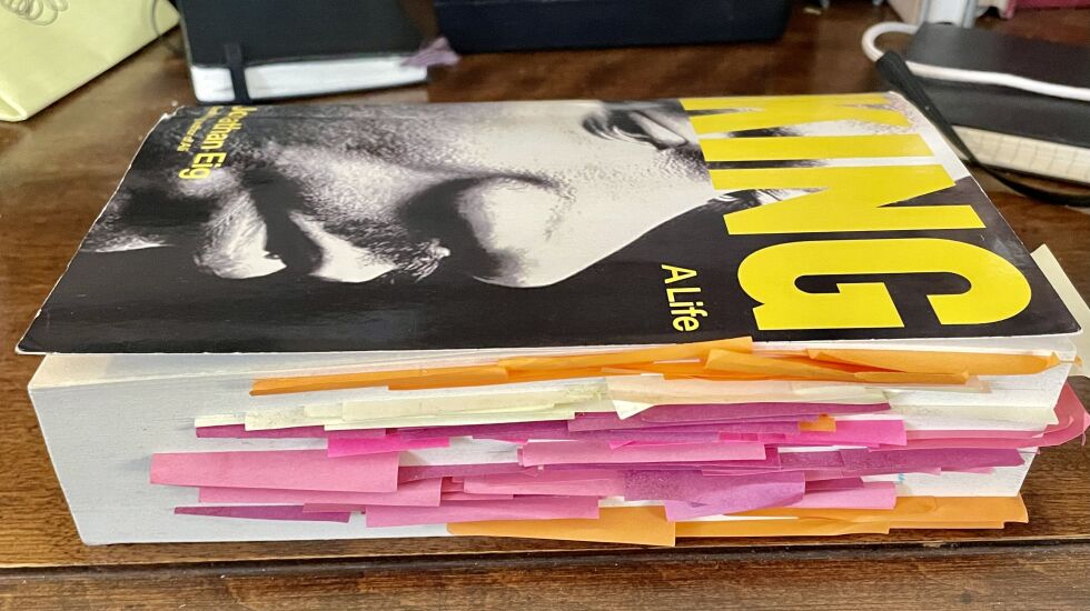 Neil Steinberg’s copy of Jonathan Eig’s “King: A Life” with important passages marked with Post-It notes. The book, being published Tuesday, is being hailed as a masterpiece. (Neil Steinberg/Sun-Times)