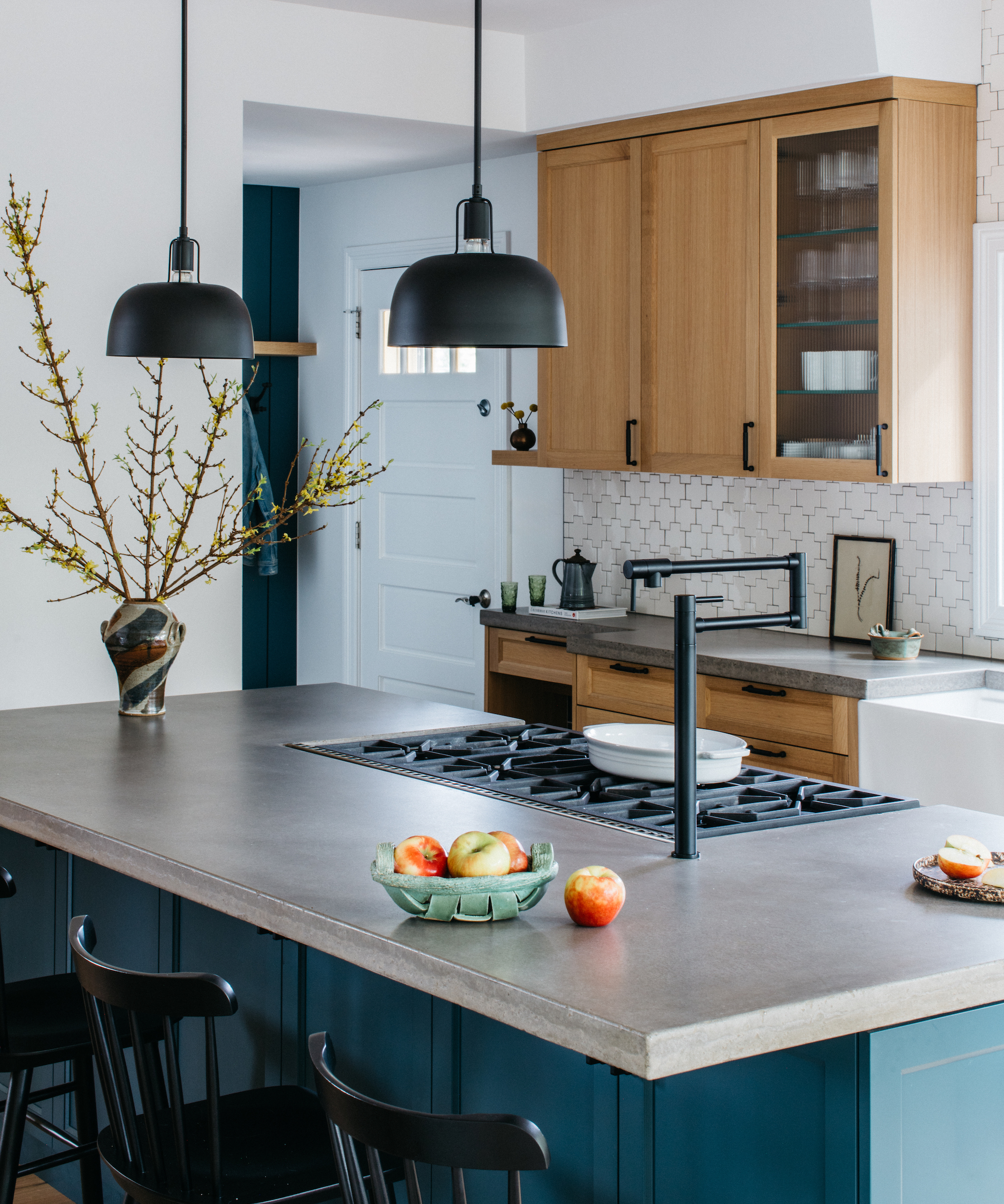 ‘A slim island gives you that extra surface for prep or a casual perch without interrupting circulation. That said, I don’t try to force it to do everything. With less depth, you’re usually sacrificing things like a sink, cooktop, or generous seating, so I prefer to treat it more intentionally.’