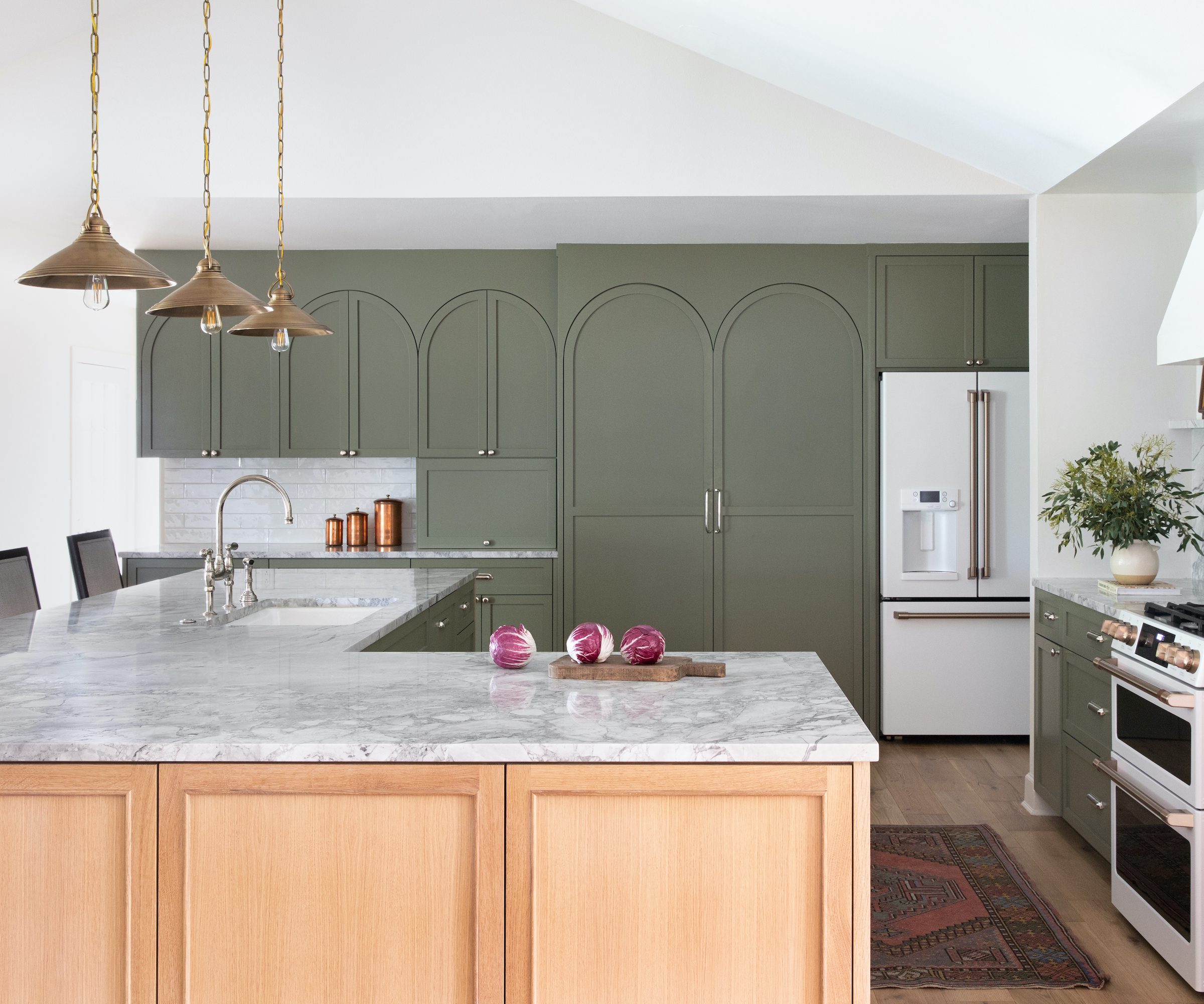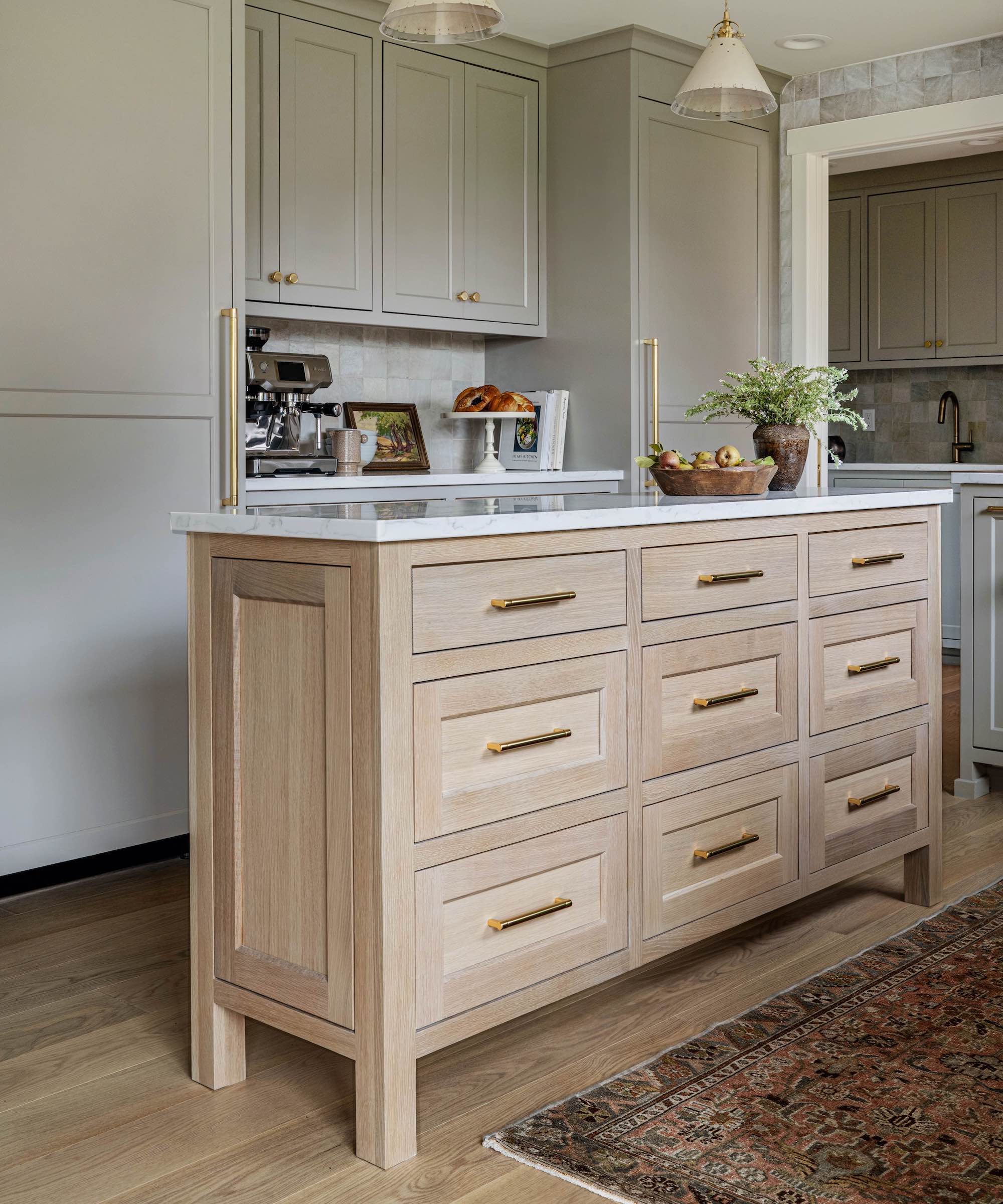 A contrasting island can be a great way to introduce personality without overwhelming the space. Deeper tones, or different materials altogether can help the island read as a focal point, while still feeling connected to the wider scheme through shared details such as hardware or countertops.