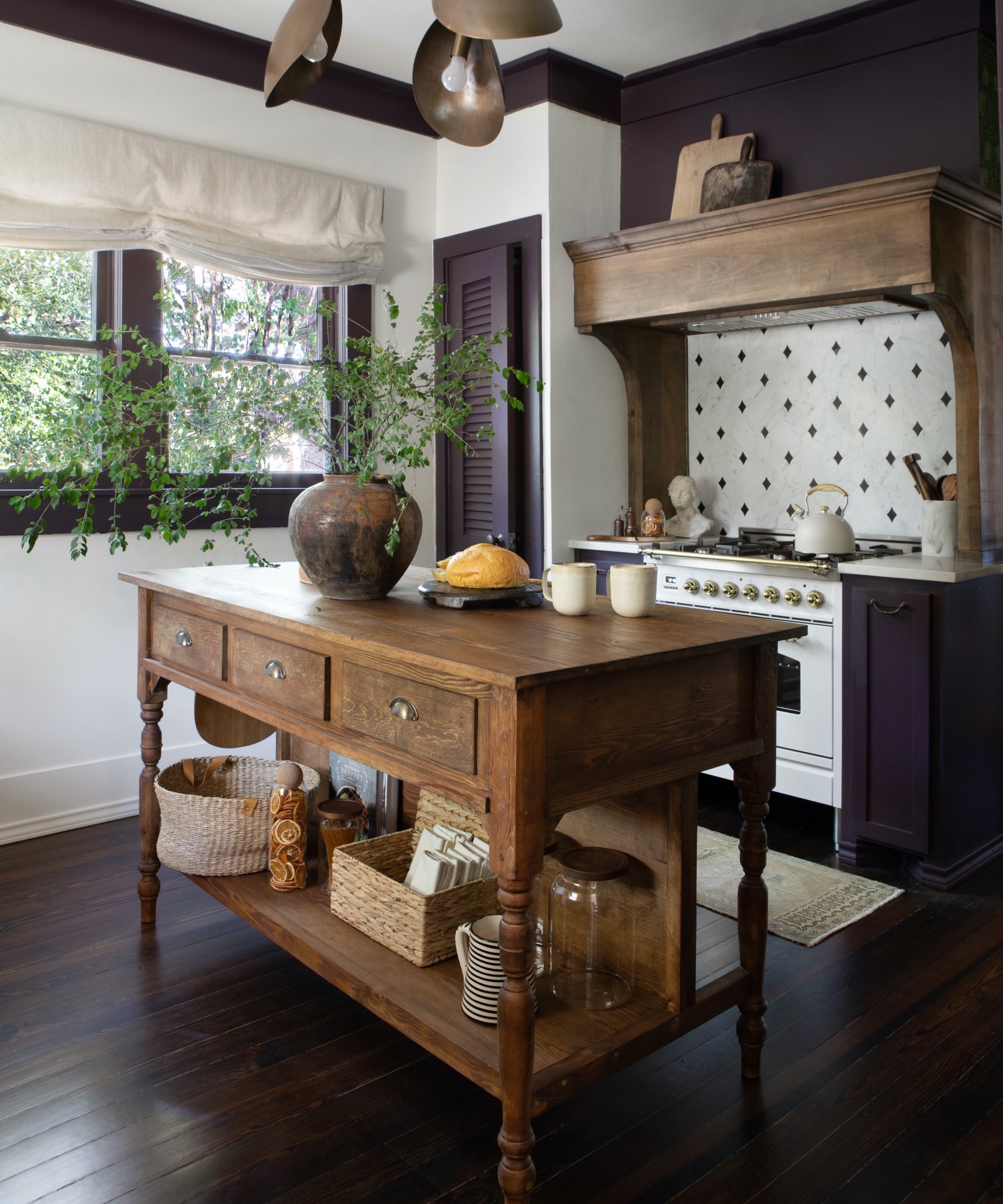 Another approach is to think beyond standard cabinetry altogether. Reclaimed or repurposed furniture – from antique workbenches to farmhouse tables or vintage shop counters – can make a striking island alternative, bringing instant character and individuality. ‘We chose this unique piece over a traditional island because it brings an aged, antique charm that perfectly complements the character of this historic cottage,’ says Ginger Curtis, founder and CEO of Urbanology Designs.