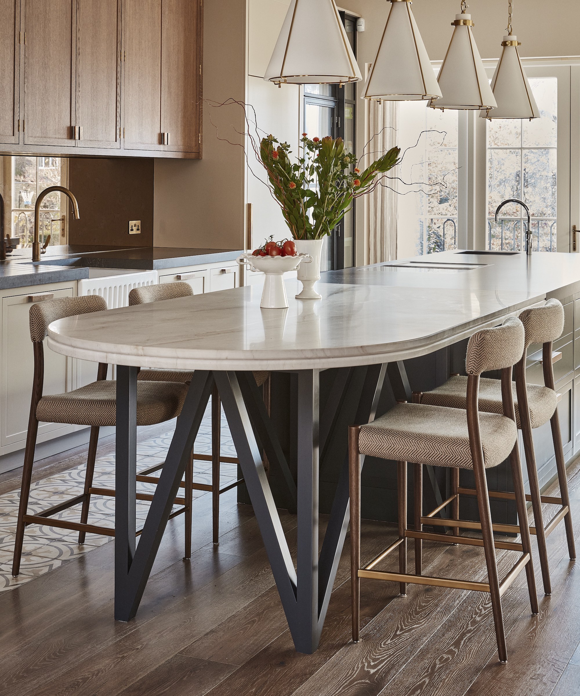 Here, Blakes London demonstrates how a few creative adjustments can lead to something far more distinctive. ‘Those diagonal legs are a clever twist. By angling the supports and setting them back from the edge, the island takes on a slightly table-like character rather than the usual solid block – an unusual detail that gives the whole piece a lighter, more architectural feel,’ says lead designer, Reuben Ward. ‘The key to keeping a bold island design timeless is balancing those expressive details with classic materials and good proportions, so the island still feels elegant and grounded rather than overly trend-driven.’