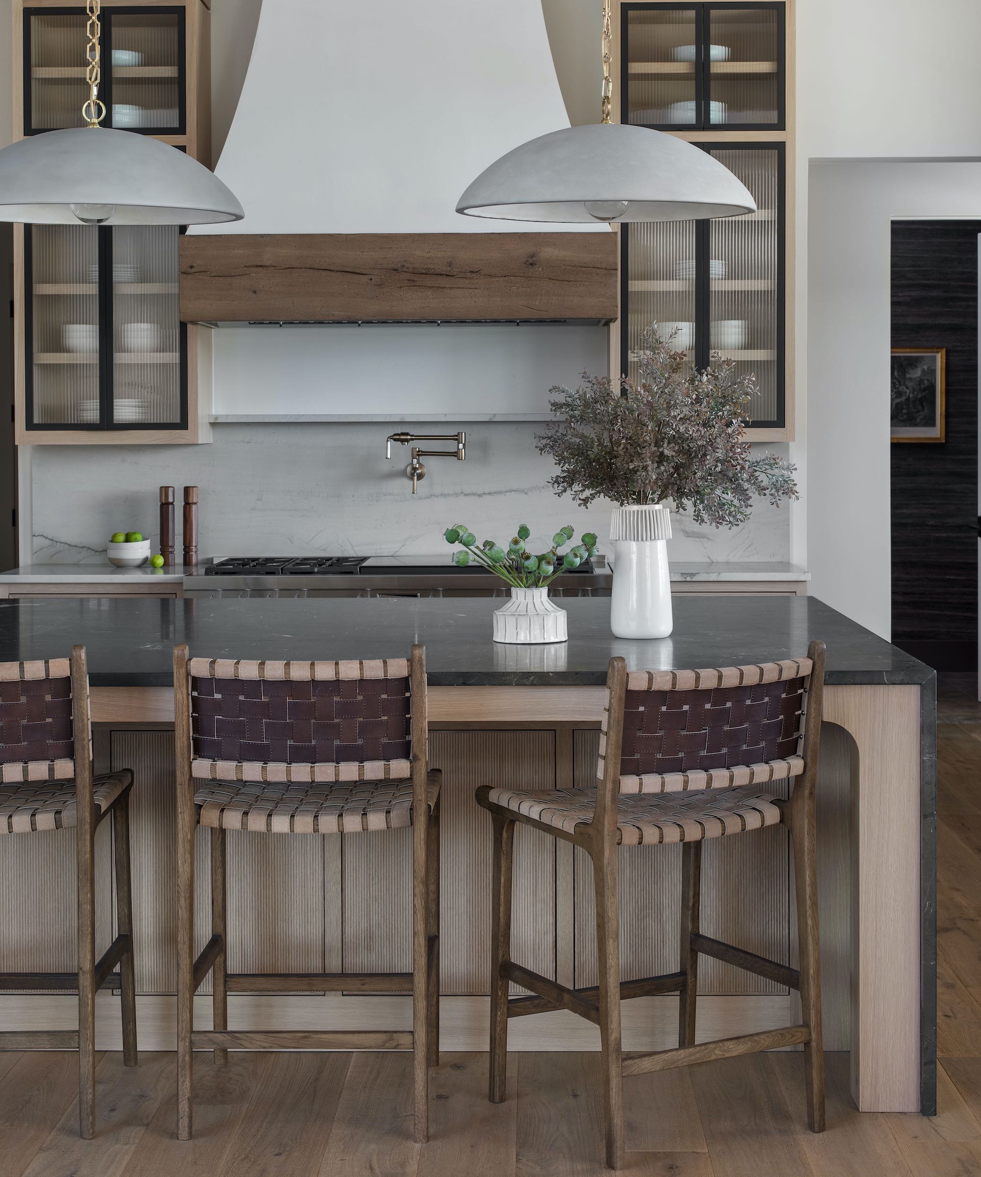 It’s also a chance to introduce subtle contrast. A darker base, fluted detailing, or a shift in finish can ground the island and give it presence without relying on bold kitchen island color. ‘I often look for ways to echo materials nearby, so everything feels connected. Here, the ribbed timber panels on the island relate nicely to the fluted glass in the upper cabinets, while the woven stools add another tactile layer. It’s a subtle way of building interest,’ adds Lindsie.