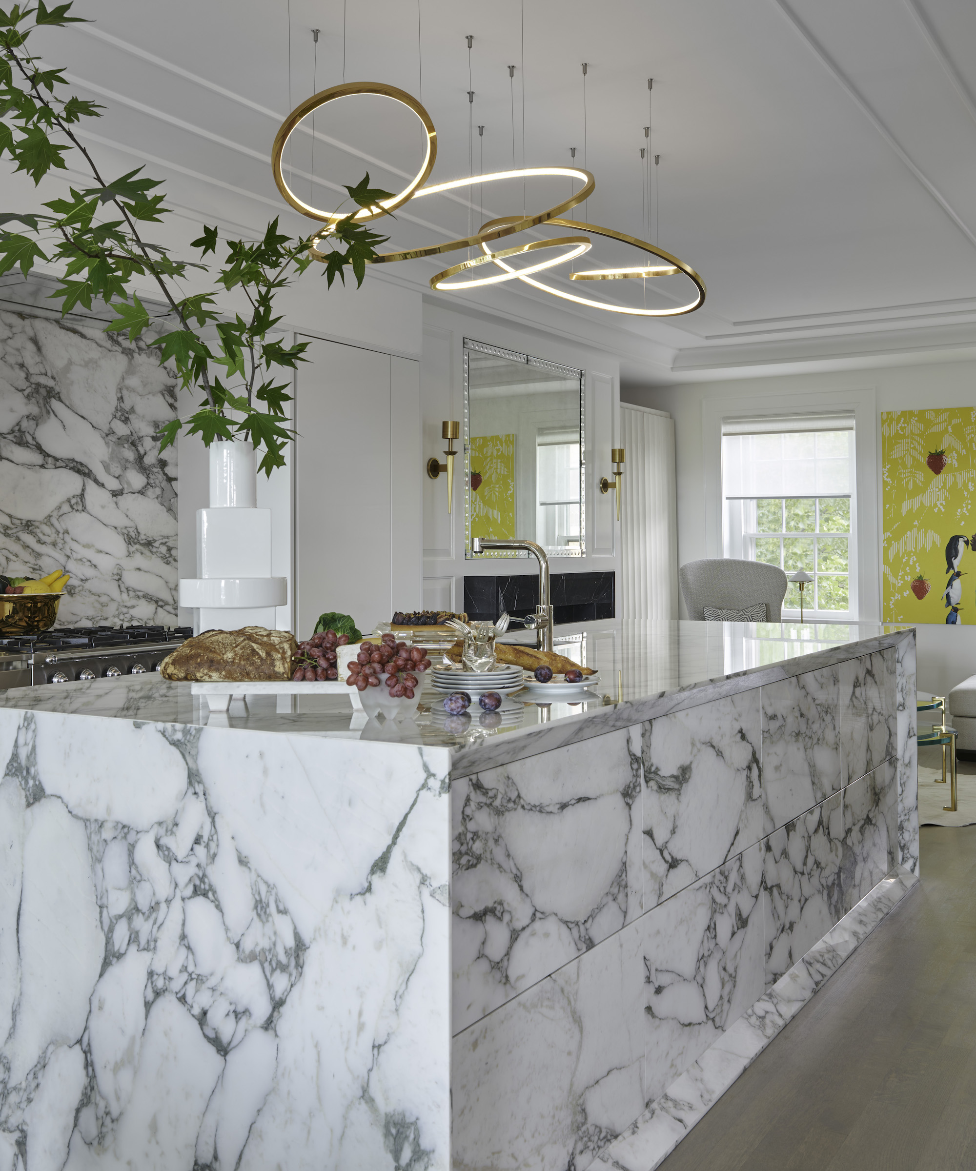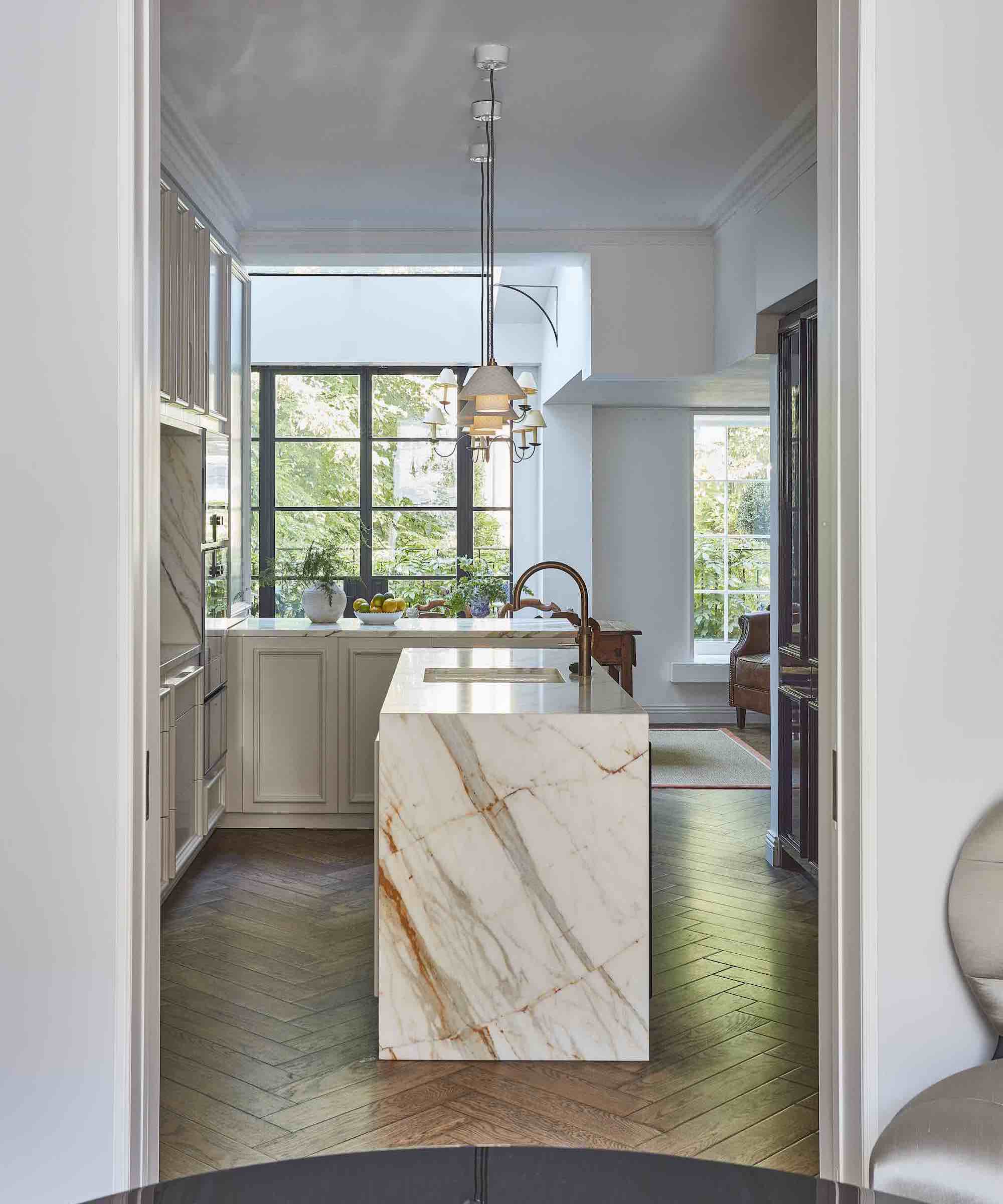 ‘In this kitchen, we intentionally split the island countertop materials to break up what could otherwise feel like a large, uninterrupted surface,’ says Rachel Morrison, principal designer at Morrison Interiors. ‘The marble anchors the prep area, while the darker stone at the seating side introduces contrast and warmth. This subtle shift helps define how the island is used while adding another layer of texture and visual interest to the space.’