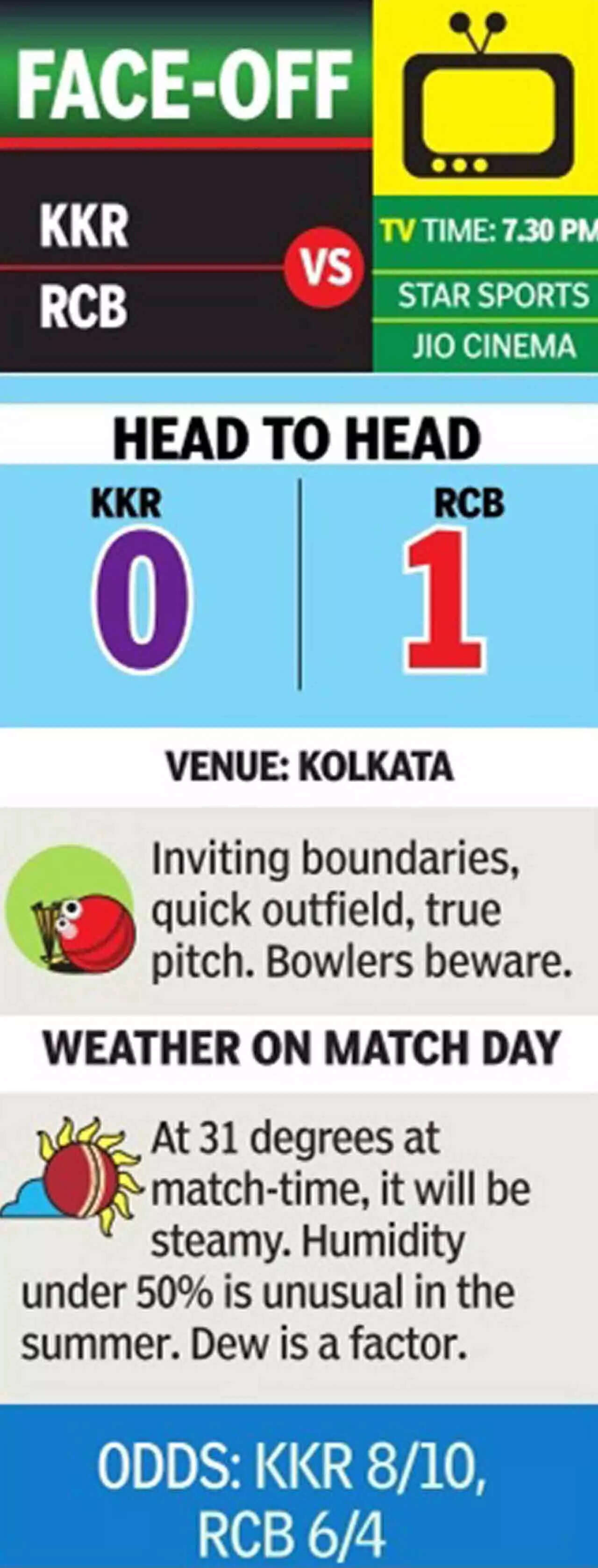 In contrast, the Faf du Plessis-led RCB were off the block in style, recording a dominant win against Mumbai Indians. Although it is an away match, the RCB will not lack inputs about the ground as their Bengal duo Shahbaz Ahmed and Akash Deep have played enough cricket here. The team management will also not hesitate to seek tips from former KKR skipper Dinesh Karthik, who would be eager to return to his former den.