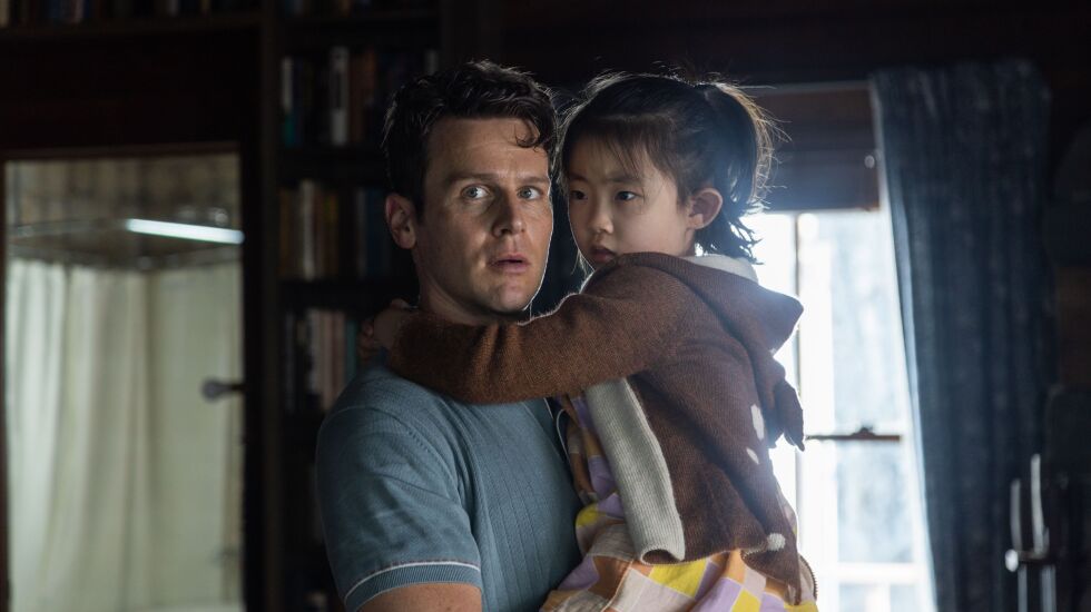 Three more figures materialize from the woods: Leonard’s friends Redmond (Rupert Grint), Adriane (Abby Quinn) and Sabrina (Nikki Amuka-Bird). They’re each wielding some sort of makeshift weapon or tool, and it’s time for Wen to run as fast as she can to the luxury cabin where she and her fathers Andrew (Ben Aldridge) and Eric (Jonathan Groff) are vacationing. It takes a moment for Andrew and Ben to realize the magnitude of what the nearly hysterical Wen is telling them — but then comes that knock at the cabin, with Leonard and his associates making it clear (in the politest terms imaginable) they’re coming in, either by invitation or through a more forceful manner.