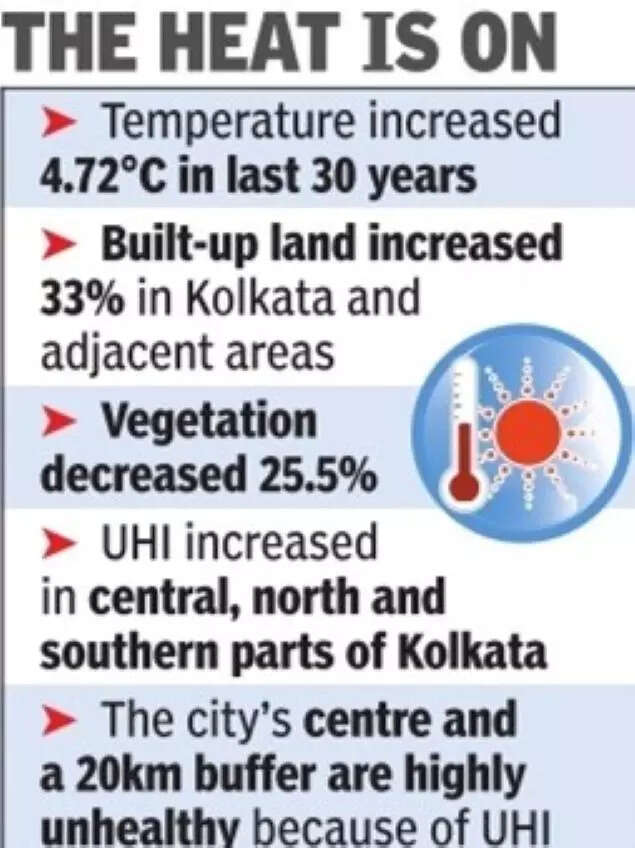 KOLKATA: The combined effect of climate change and rapid urbanisation has triggered an urban “heat island effect” in Kolkata, with the city’s annual mean land surface temperature rising as much as 4.72°C in the last three decades, causing heat distress to both flora and fauna, claims a recent study by Calcutta University and Vidyasagar University.