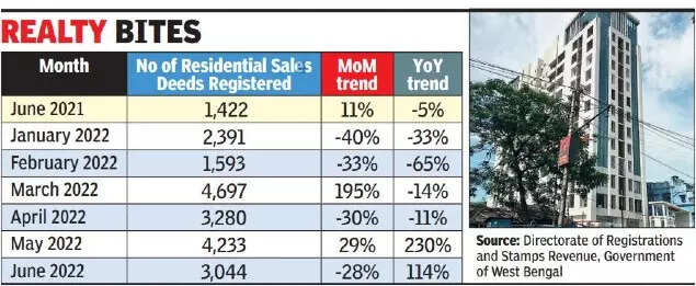 KOLKATA: Some 3,044 residential sales documents were registered in Greater Kolkata in June 2022, a 114% increase over 1,422 registrations in June 2021 when the city was reeling under the grip of the second Covid wave. But the count was down 21% against May 2022 when 4,233 sales documents were registratered.