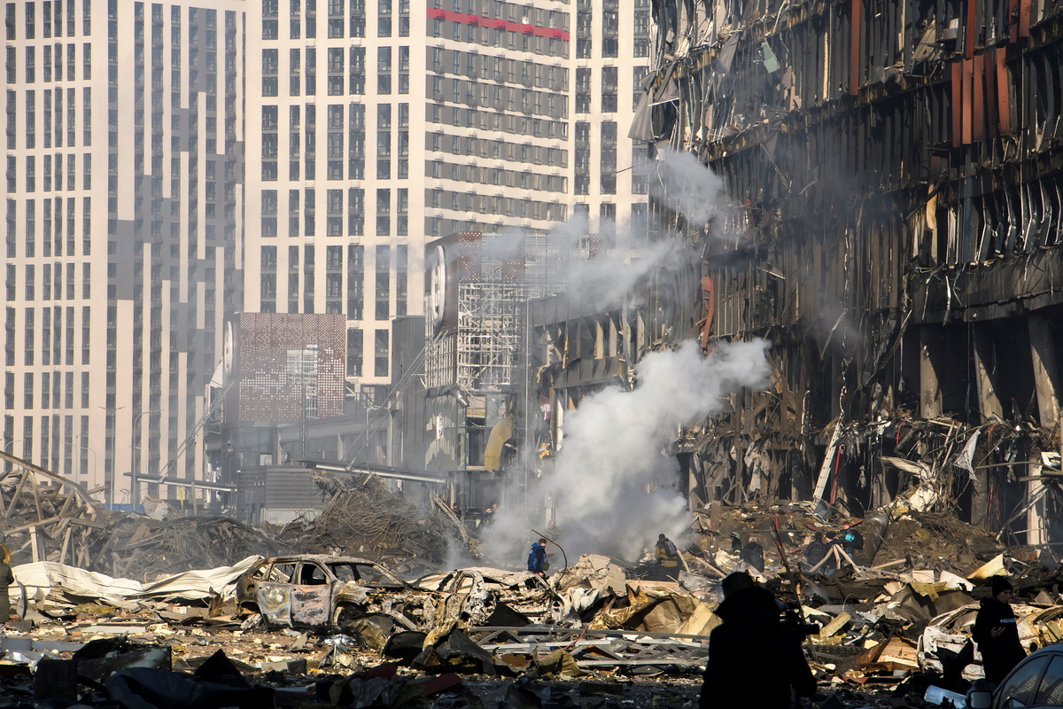 The site of a destroyed shopping center is seen after it was hit in a military strike in the Podilskyi district of Kyiv, as Russia's invasion of Ukraine continues, in Kyiv, Ukraine March 21, 2022. REUTERS/Vladyslav Musiienko