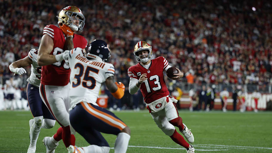 The San Francisco 49ers were able to outscore the Chicago Bears, 42-38, in a Sunday night shootout. Brock Purdy rebounded from a pick-six on his first pass attempt of the game in a big way, throwing for 303 yards and three touchdowns (he also ran for two scores) to put his team in position to earn the NFC's No. 1 seed with a win next Sunday. His most memorable moment came when, in true rodeo fashion, he scrambled around for eight seconds with surprising athleticism before finding Kyle Juszczyk for a touchdown.