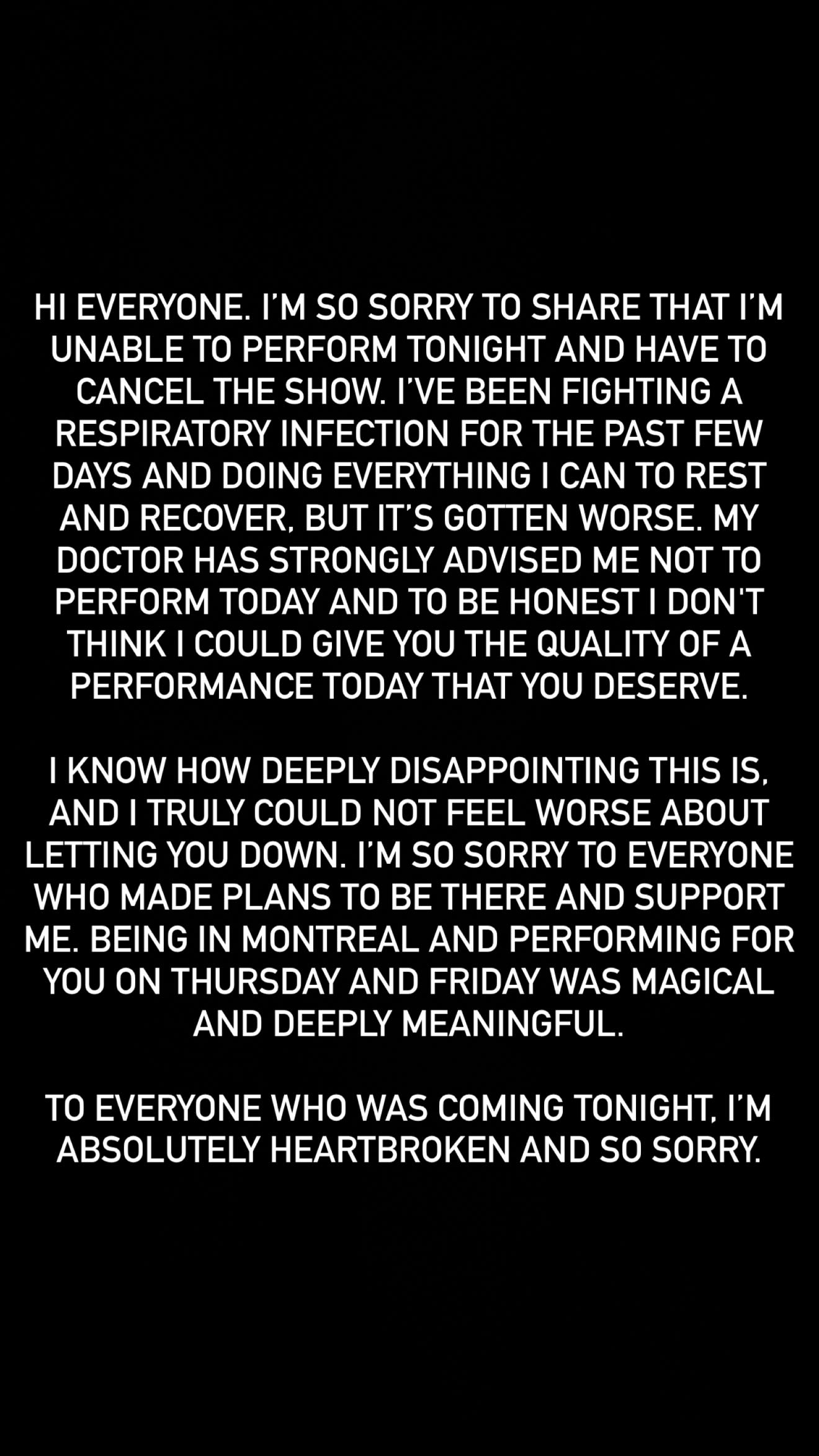 She continued, “I know how deeply disappointing this is. And I truly could not feel worse about letting you down. I’m so sorry to everyone who made plans to be there and support me. Being in Montreal and performing for you on Thursday and Friday was magical and deeply meaningful.”