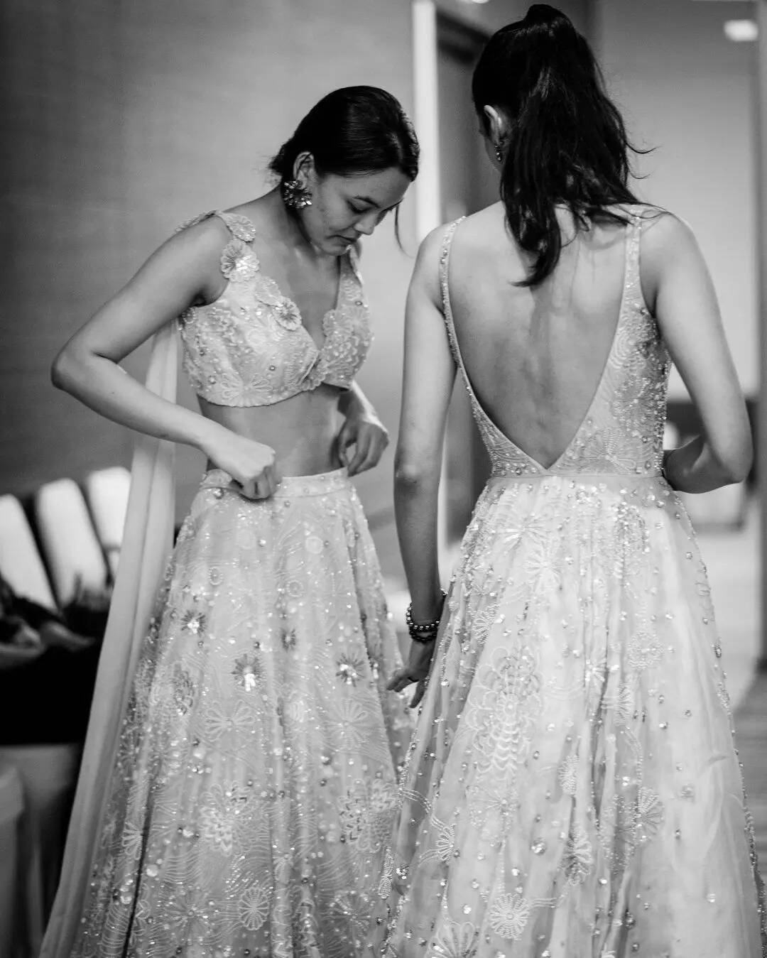 Shantnu & Nikhil's collection 'Capella', revisits the opulence that was served by the Baroque Era and its majestic artifact: The Chandelier. Owing to the era, embroideries are inspired by the Baroque motif leaves lace, and architecture.