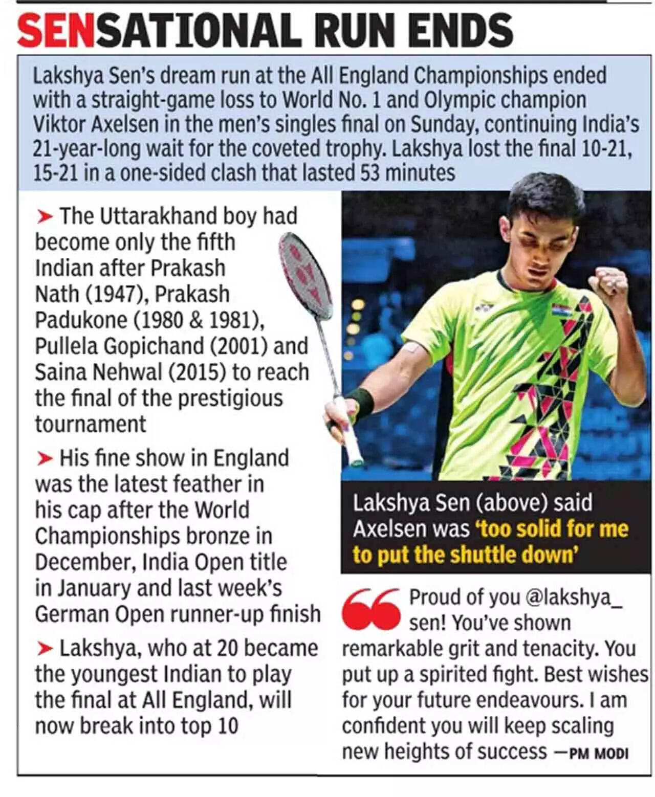 Lakshya Sen faltered at the final hurdle of the All England Badminton Championships in Birmingham on Sunday. His 10-21, 15-21 loss to Denmark's Viktor Axelsen means India's 21-year-old jinx at this tournament continues - Pullela Gopichand was the last Indian to win the title in 2001.