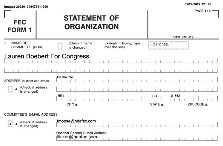 Previously, Boebert’s campaign listed its email addresses as one belonging to treasurer Mike McCauley and another connected to the partner of a Denver-based law firm. Monday’s filing still lists McCauley as the campaign’s treasurer, but both email addresses now direct to a Virginia firm named Huckaby Davis Lisker, which focuses on financial consulting and compliance issues for Republican groups. FEC records show that the National Republican Senatorial and Congressional Committees are among its clients. Boebert’s campaign has not reported previously paying Huckaby Davis Lisker.