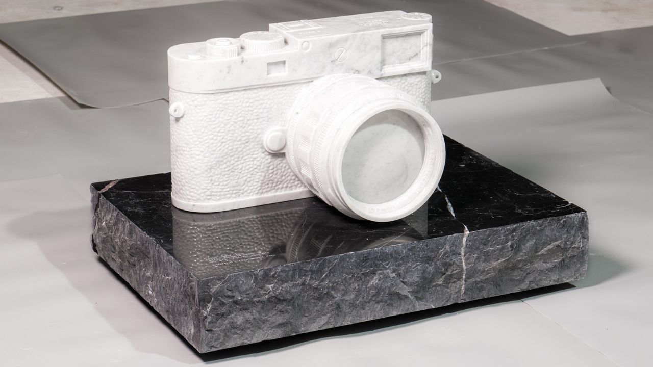 After all, the attention to detail is obsessive, as you'd expect when Leica's involved. Every engraving, every lens marking, every serial number on the marble sculpture corresponds precisely to the real camera. Furthermore, the inversion from the M11 Monochrom's signature black to pristine white marble works as clever symbolism; black-and-white photography rendered in actual black-and-white materials.