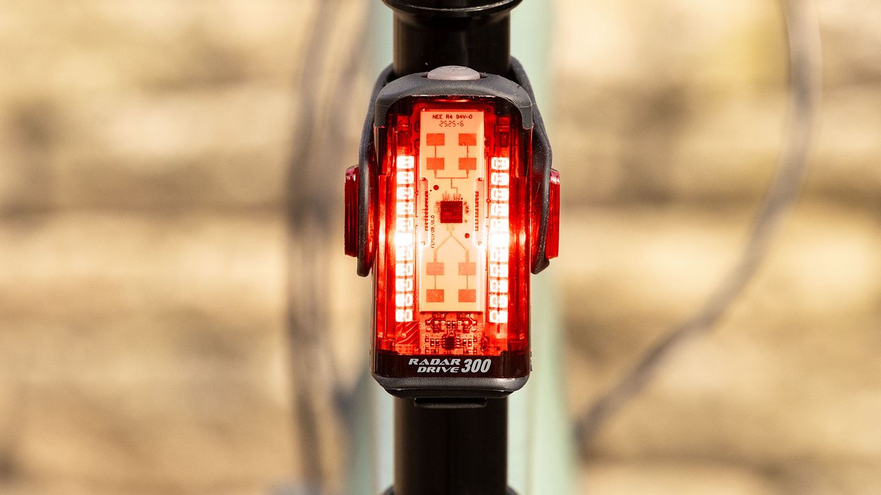 The Radar Drive Rear’s brutish aesthetic is dominated by a huge wraparound transparent polycarbonate lens that covers the entire rear-facing panel and sides. It screams ‘see and be seen’ – a bold look that prioritises safety over svelteness. At 104g for just the light alone, it’s a bit of a lump. However, the co-moulded construction feels incredibly sturdy and carries an IPX7 waterproof rating, which was well-tested during a particularly soggy British winter.