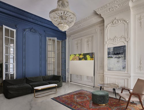 The 65-inch Easel TV uses LG OLED’s evo tech and is built with an a9 Gen 5 AI processor. The Easel has an 80W, 4.2-channel, sound system that can fill the room with surround sound as well as a movable fabric cover made by Danish textile company Kvadrat. To sweeten the deal, the fabric can be controlled by the TV’s remote. The cover can also be brought up partly in Line View to show some additional features like the clock, date, or audio player.
