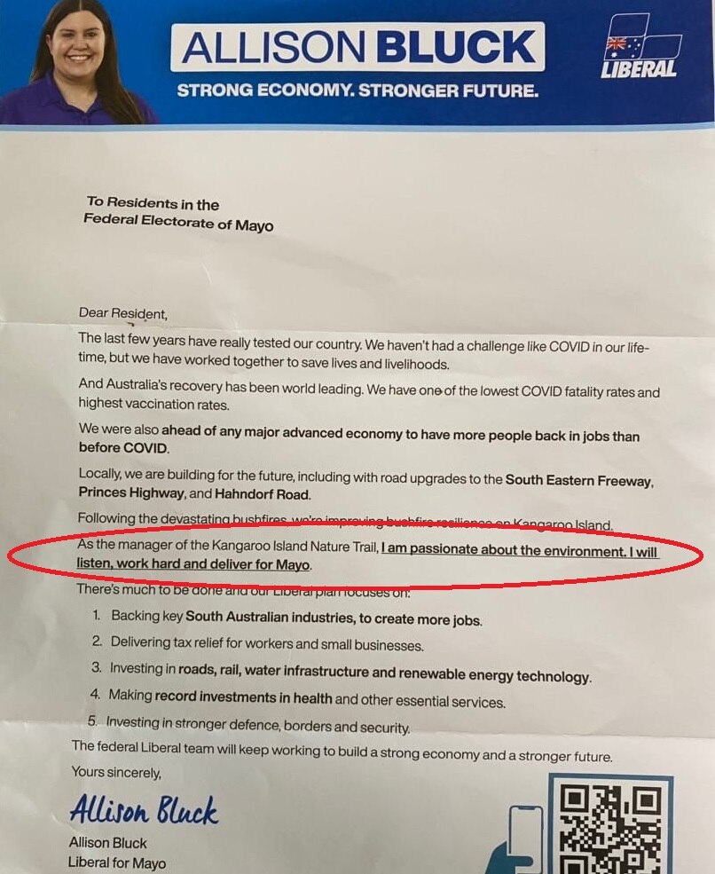 "As the manager of the Kangaroo Island Nature Trail, I am passionate about the environment," Ms Bluck's letter stated.