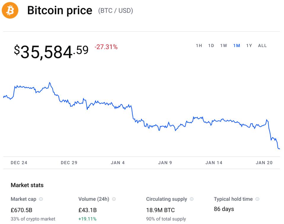 The bitcoin price has this week fallen to levels not seen since July last year, losing 20% over the last week and dropping to half its all-time high of almost $70,000. Other top ten cryptocurrencies ethereum, BNB, solana, cardano and XRP have all lost between 20% and 30% from their price this past week (with Wall Street giant JPMorgan issuing a stark ethereum price warning).