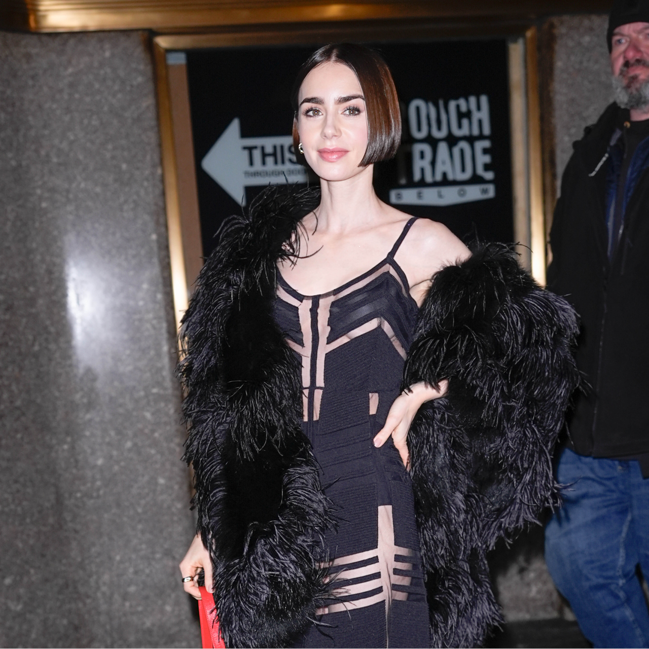On Dec. 15, Collins appeared alongside her co-stars at the Paris premiere of Netflix's Emily in Paris, and of course, her Parisian glam was more on point than it's ever been. For the event, Collins wore a black, crystal-embellished Armani Privé gown with a plunging neckline and a flared, bubble attachment at the waist. As for makeup, she wore black mascara and a berry lipstick, but it was her hair that really pulled the look together and added a bit of edge. She styled her dark hair—which she recently cut even shorter into a bixie haircut after wearing a chin-length bob for months—in a sleek, almost wet look that was combed back.