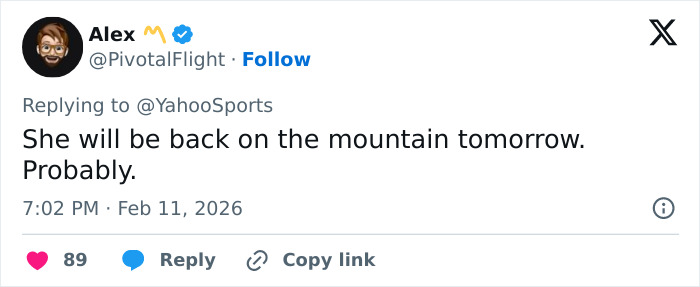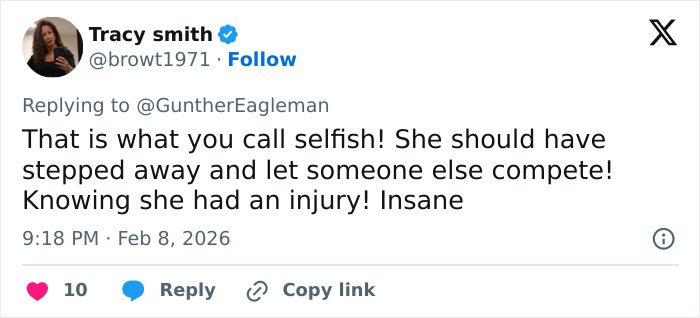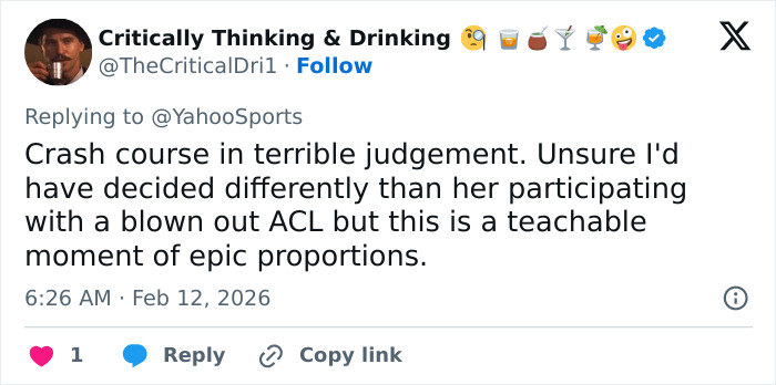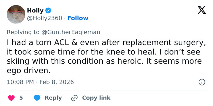“My ACL and past injuries had nothing to do with my crash whatsoever,” she wrote, explaining she was “5 inches too tight” on her line when her arm hooked a gate and twisted her into the fall.