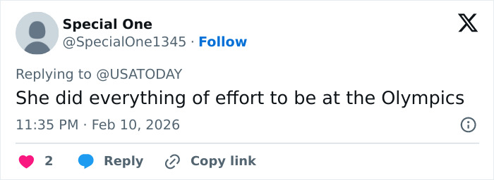Despite the circumstances and consequences, she said she has “no regrets” about entering the start gate.