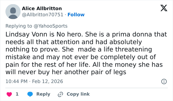 Vonn was chasing a fourth Olympic medal after coming out of retirement in 2024. She had stepped away from skiing in 2019 due to chronic knee pain and a string of injuries.