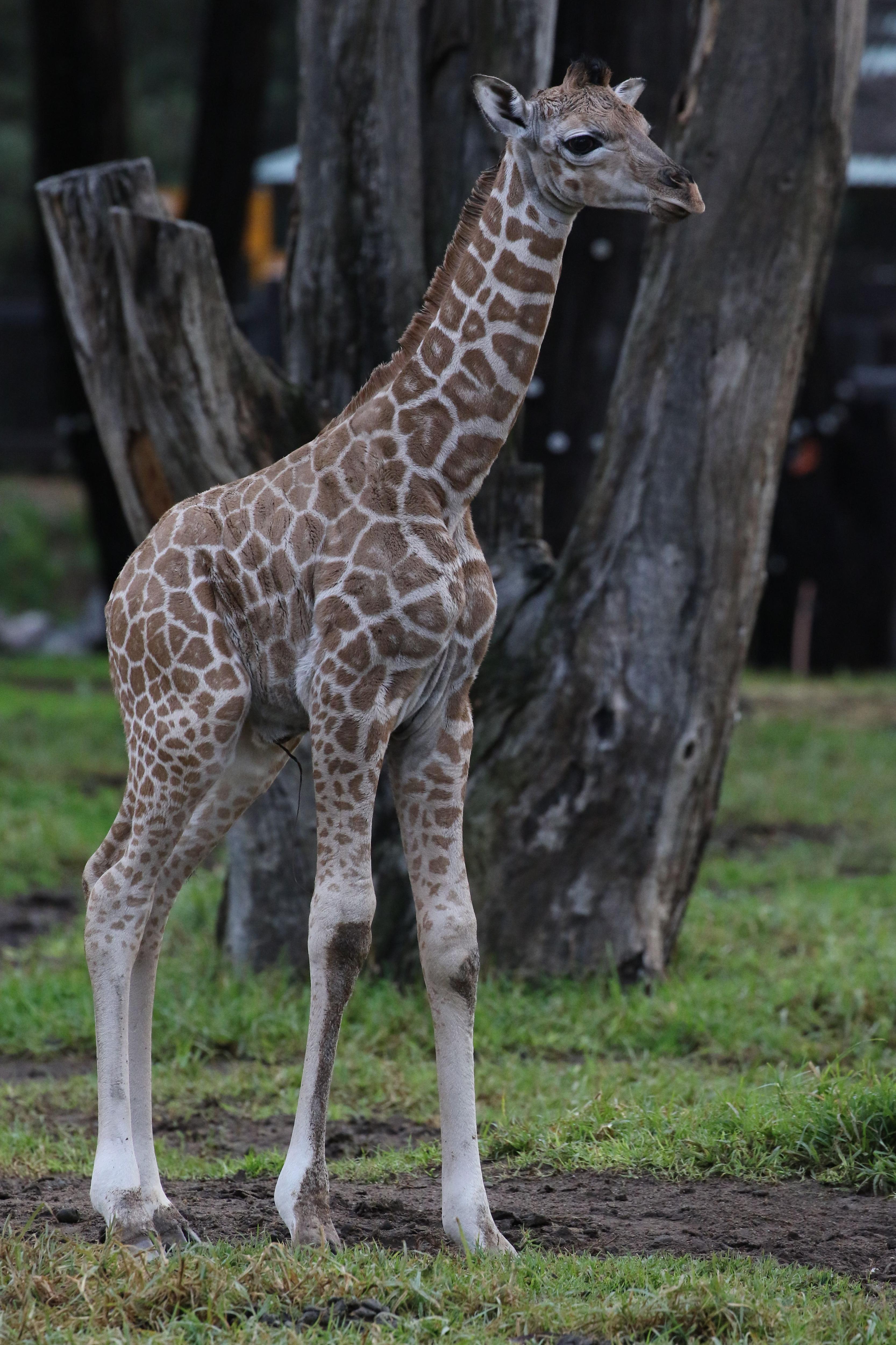 After struggling to stand, the newborn giraffe needed a nudge from mother Mvita’s gentle hooves to help it find its wobbly legs.