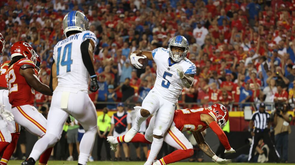 Amon-Ra St. Brown had six catches for 71 yards and a score, and Lions rookie Brian Branch returned Patrick Mahomes’ first pick in an opener 50 yards for another touchdown, helping Detroit snap the Chiefs’ eight-game Week 1 winning streak.