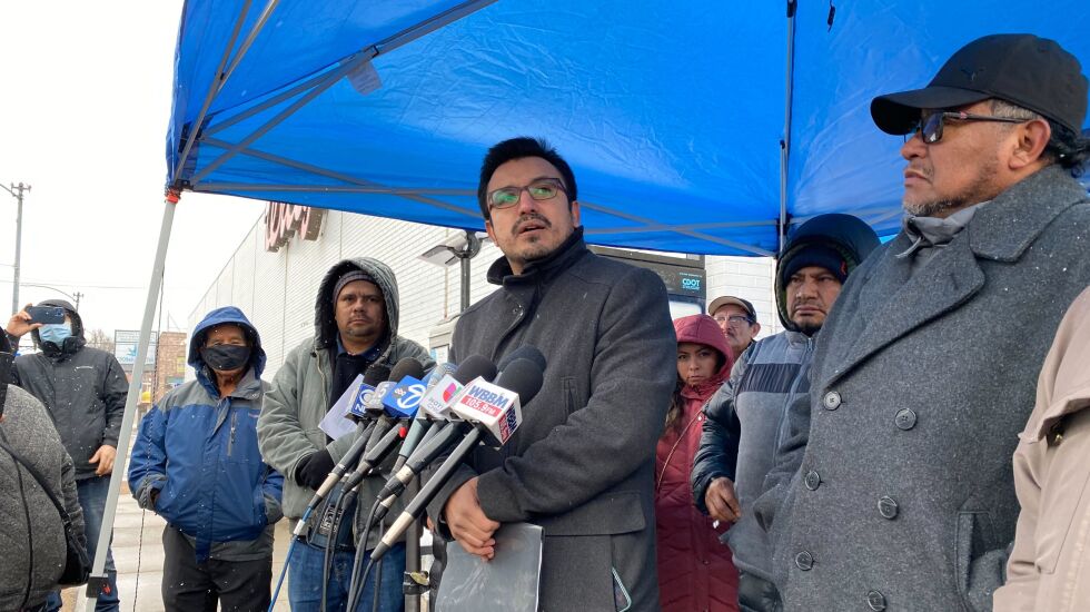Ald. Byron Sigcho-Lopez (25th) speaks at a news conference Friday in Little Village about the need for increased protection for the Lower West Side’s street vendors, many of whom say they have been robbed in the last few months. (Michael Loria/Sun-Times)