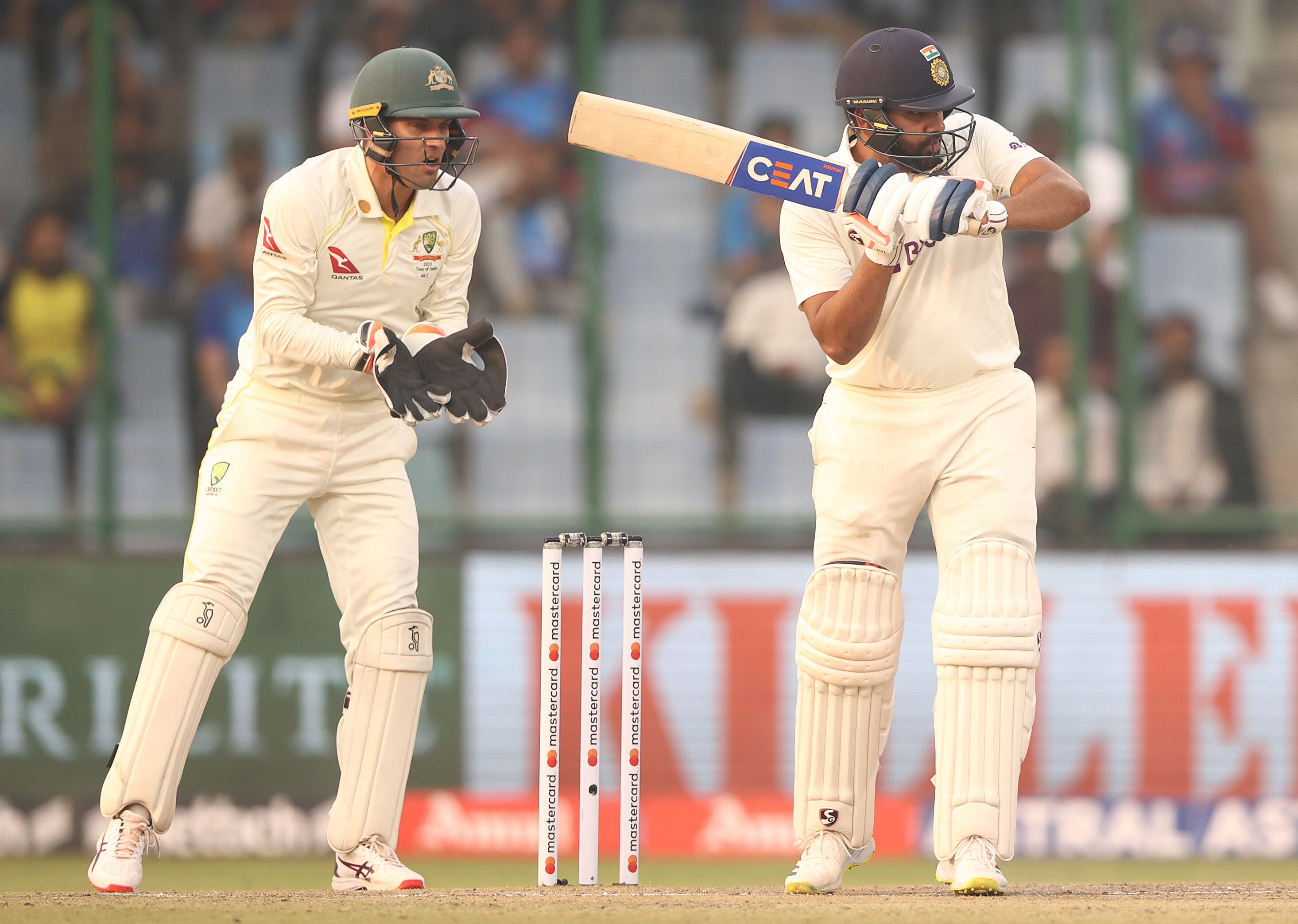 Quick work behind and around the stumps, Renshaw at silly point slaps the ball off his palm to Carey, who rips the stumps out the ground. Rohit was back though.