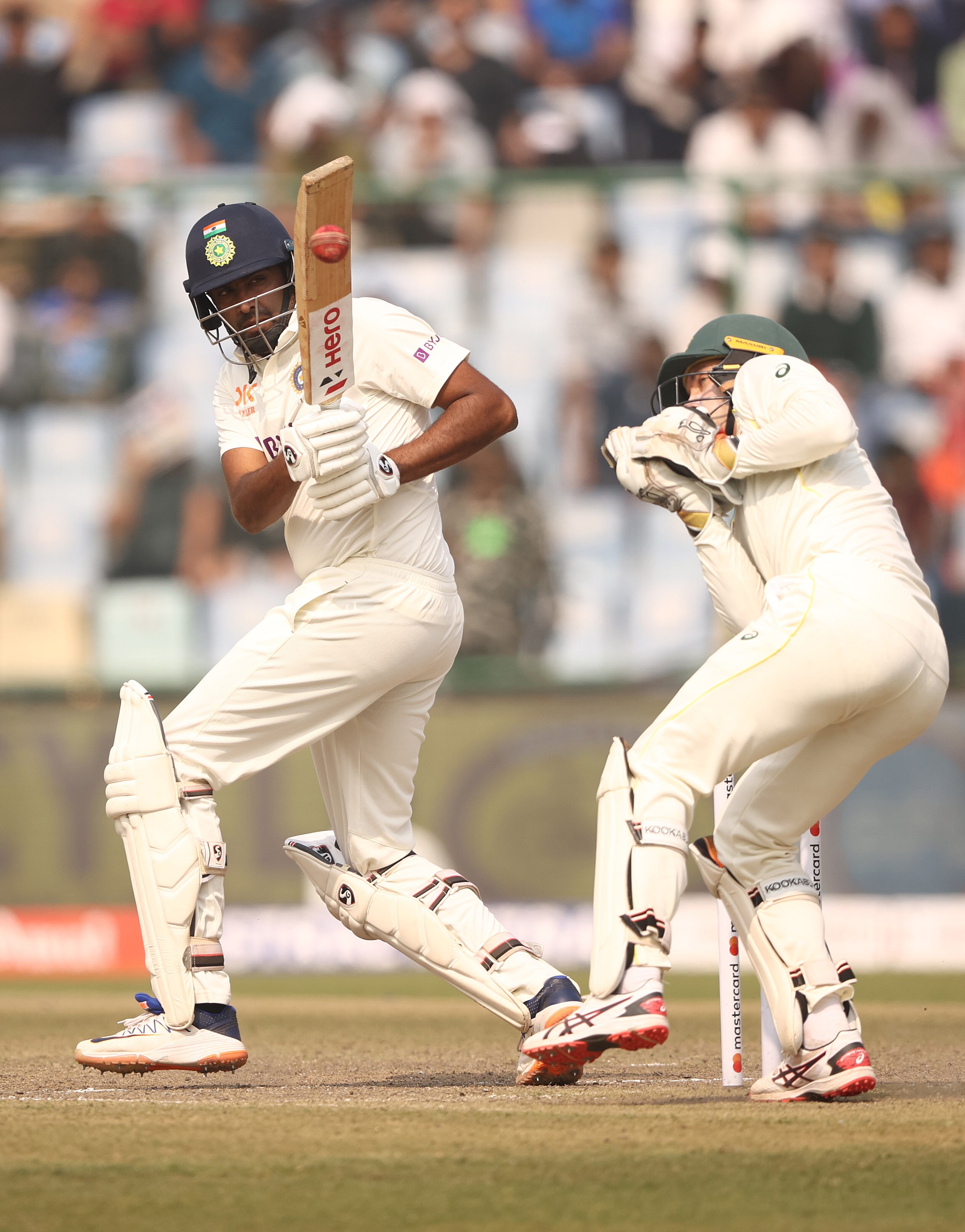 Good shape from Ashwin, Head gets forward and crouches to defend.