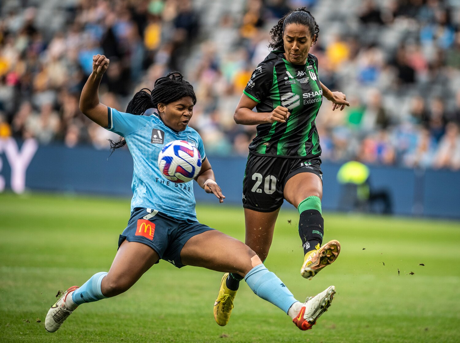 She blazes past three Sydney players, extending her long stride with the ball at her feet, eating up the green metres before a slightly heavy touch is thumped away by Charlotte McLean.