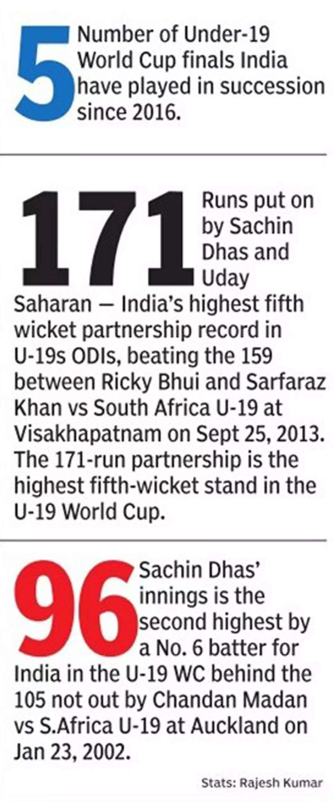<p>Sachin Dhas and captain Uday Saharan put up a 171-run stand — India's highest fifth wicket partnership record in U-19s ODIs.</p>Getty Images