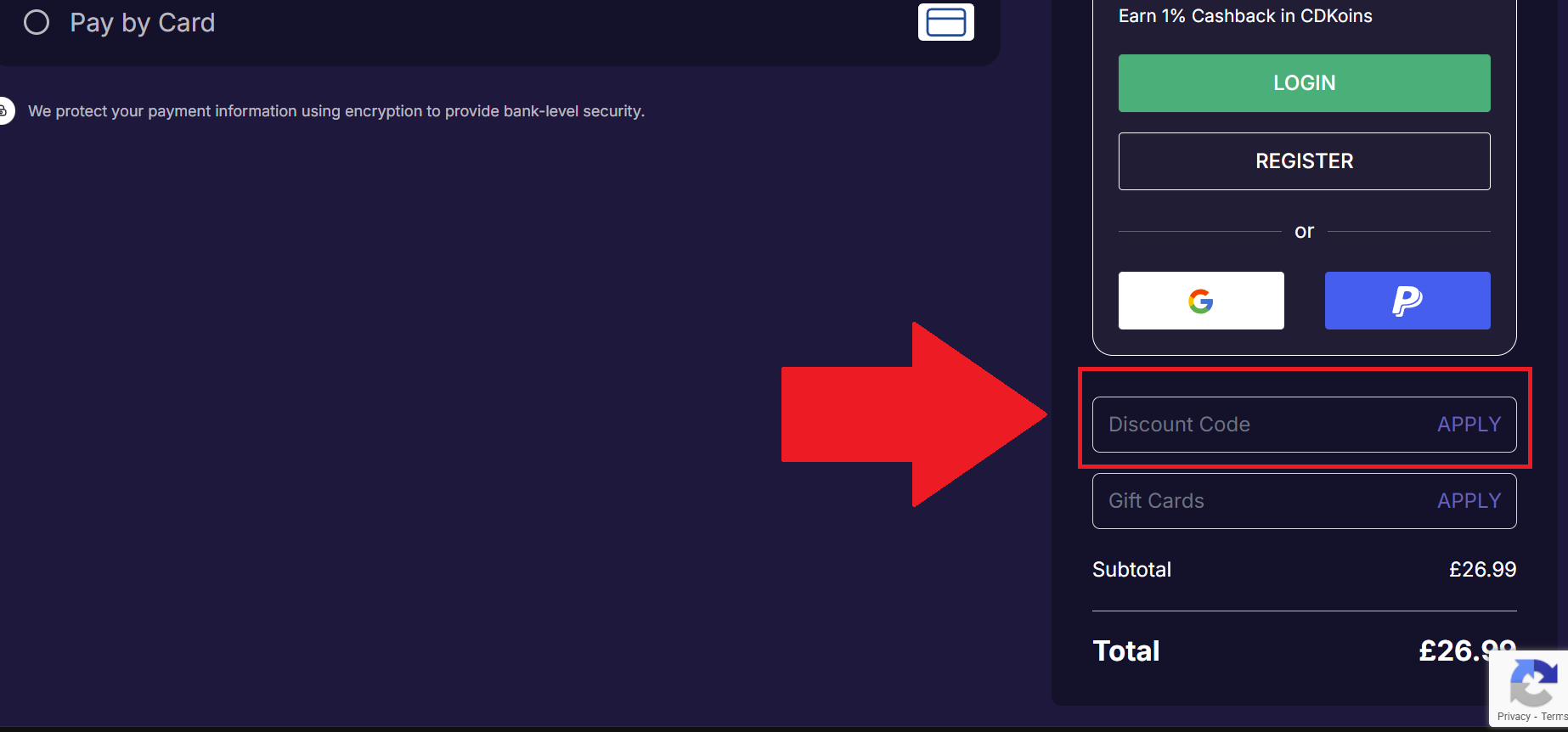 - Paste your code in the box that says ‘Enter Discount Code’ and then click ‘Apply’.