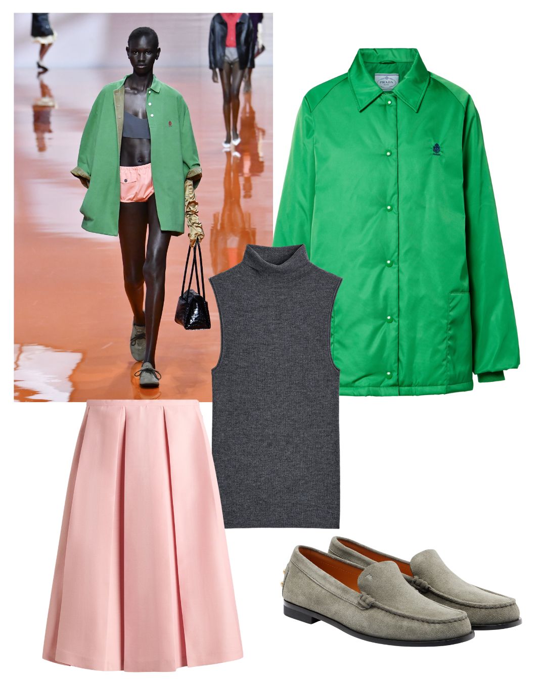 An impressive number of labels sent this trio of shades down the catwalk—Stella McCartney, Fendi and Prada, included. Whether that's a pink shoe with a grey suit and green bag, a pink shirt and grey skirt, or this warm weather shorts and jacket style, this selection of shades feels decidedly fresh.