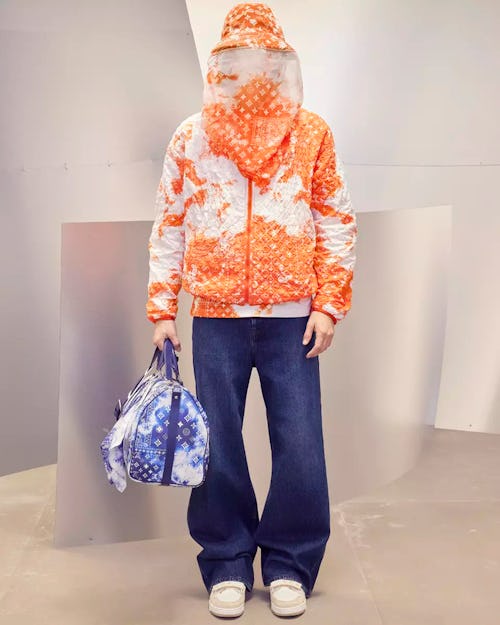 Street style influences can be seen throughout the collection as well, through the logo bucket hat, beekeeper hats, paisley leather, oversized chains, and layered skirts. While formal pieces are paired with laidback and functional ones, the blend of both could be seen as Abloh’s underlying effort to move menswear beyond men and into the genderless — or, in his words, trendless. “I believe that building blocks stacked upon each other throughout our lives form the narrative of what defines menswear,” Abloh said, according to press notes.
