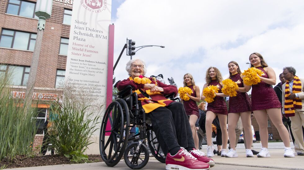 Sister Jean Dolores Schmidt, of the Sisters of Charity of the Blessed Virgin Mary, celebrated her 103rd birthday on Sunday with a clout-heavy bash and a dedication at the Loyola Red Line plaza, which was renamed in her honor. The area is now marked by a large sign as the “Home of the world famous Sister Jean.”