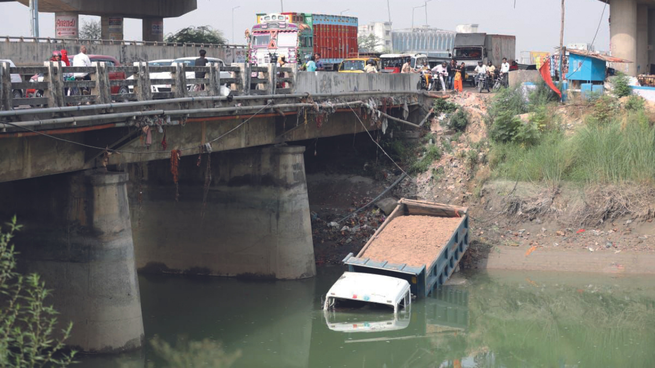 The truck driver tried to overtake vehicles on the bridge from an opening on the left side. He apparently thought that there was a side lane, but that actually was a dry part of the canal with a steep fall. Later the truck was pulled out with the help of cranes.