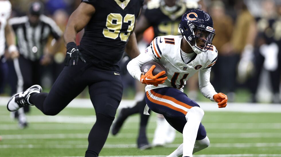 Bears wide receiver Darnell Mooney (11) makes a move after a pass reception Sunday. Mooney had five catches for a season-high 82 yards in the Bears’ 24-17 loss to the Saints at Caesars Superdome. (Wesley Hitt/Getty Images)