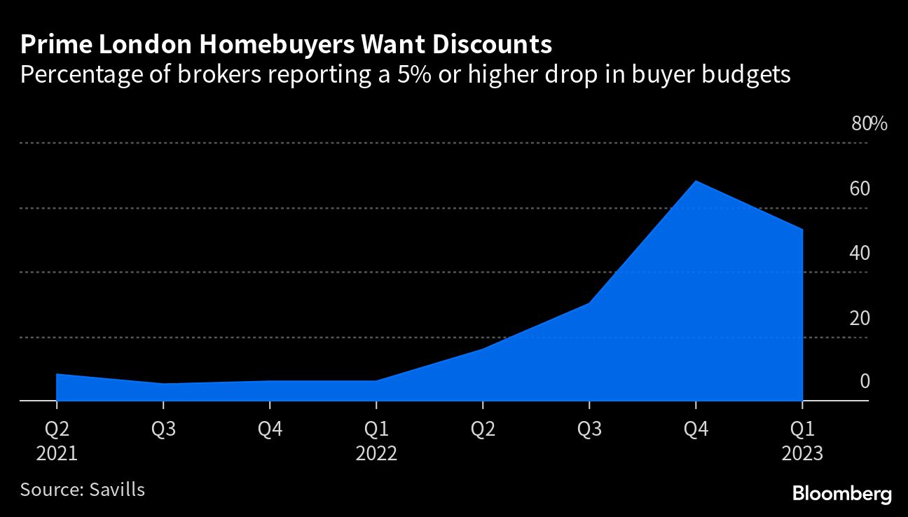 Over half of prospective purchasers looking for a prime London property expected at least a 5% discount in the first three months of the year, compared with 6% in the same quarter of 2022, according to a report from broker Savills Plc. Meanwhile, only 13% of sellers were prepared to drop their price by 5% or more in the same period, underscoring the widening gap between buyer and seller demands in the capital.