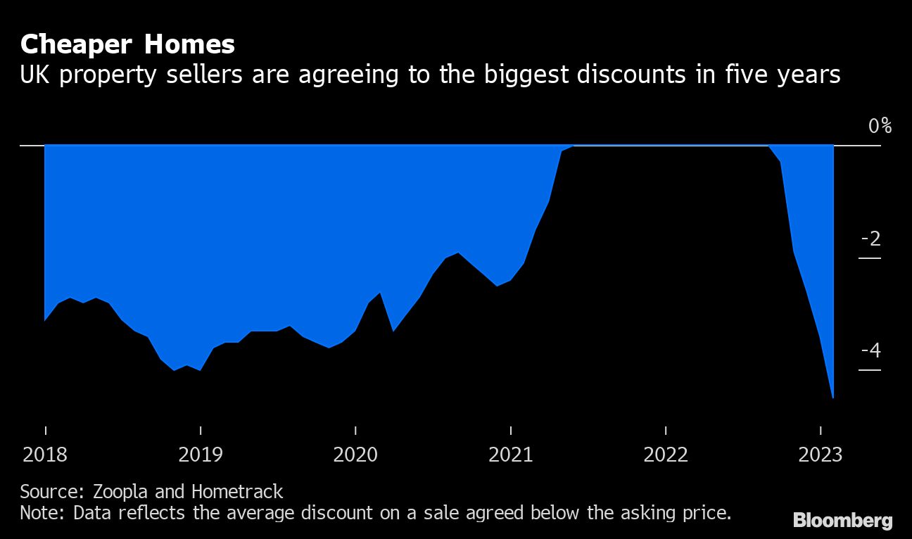 Discounts have been sneaking into Britain’s housing market since the end of 2022, as higher borrowing costs and a drop in house prices tilt the balance of power in favor of buyers. The average discount to asking price to close a sale was 4.5% in February, according to property portal Zoopla, the most in more than five years.